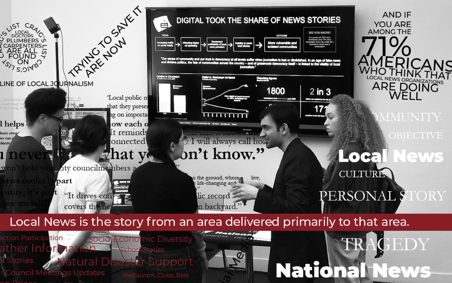 The project was showcased as an exhibition, drawing attention to how the loss of local news diminishes the public’s ability to hold local institutions accountable and sustain an informed community. By combining a historical narrative with visual storytelling, the project encourages viewers to actively support and engage with their local news outlets.